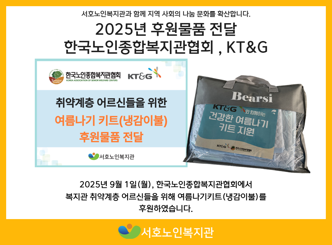 - 내용 : 한국노인종합복지관 협회와 KT&G에서는 지역 내 저소득 어르신들을 위해 여름냉감키트 이불 4세트를 후원해주셨습니다.